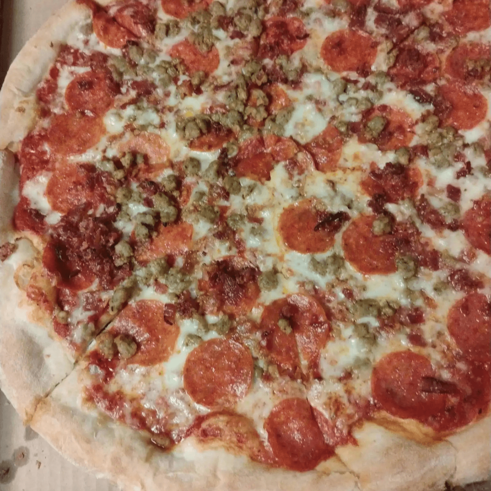 Sausage, pepperoni & bacon. We use 100% all-natural cheese.