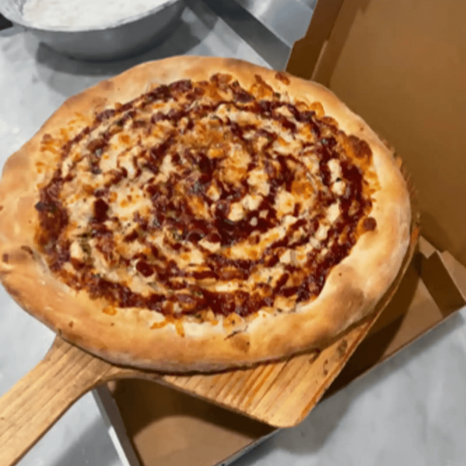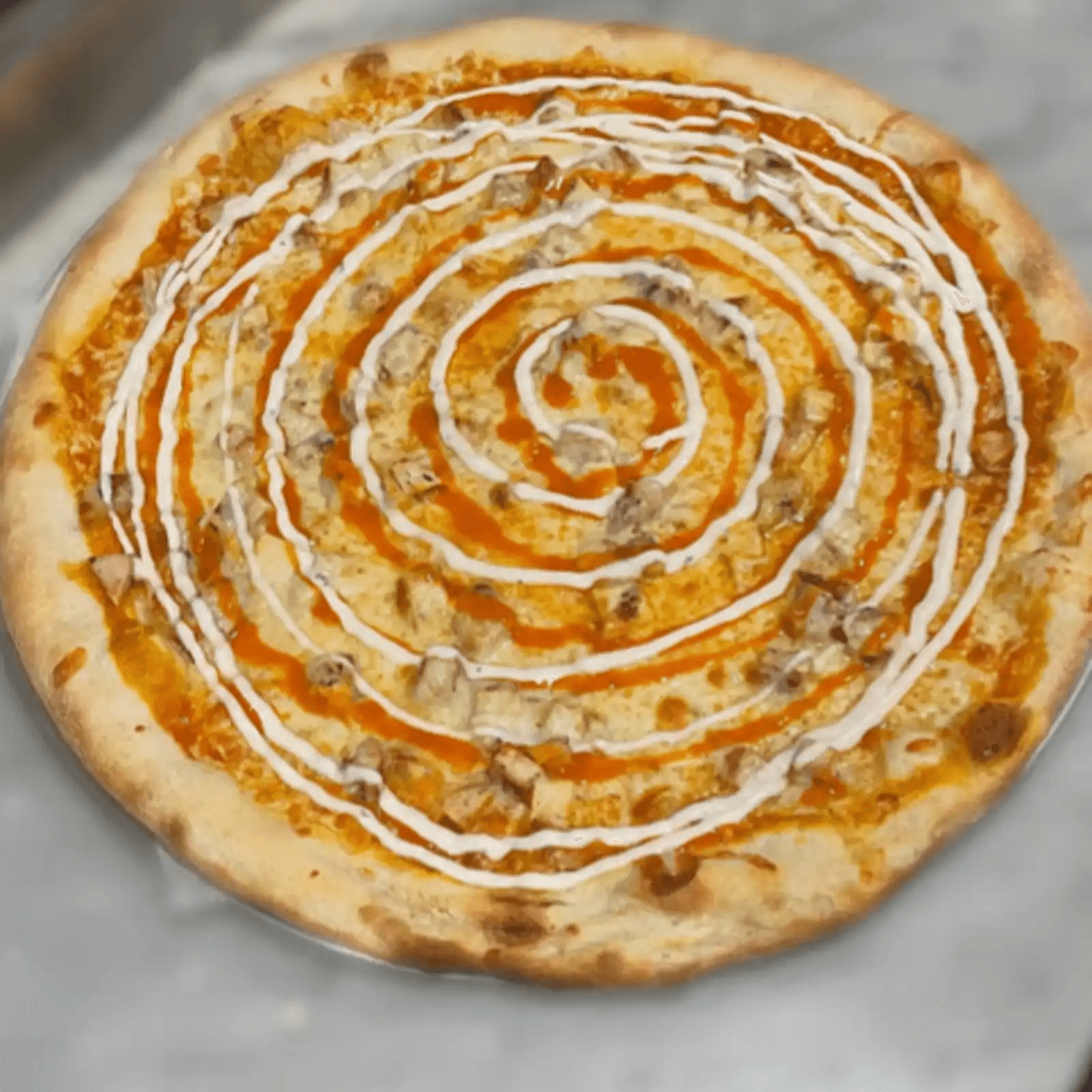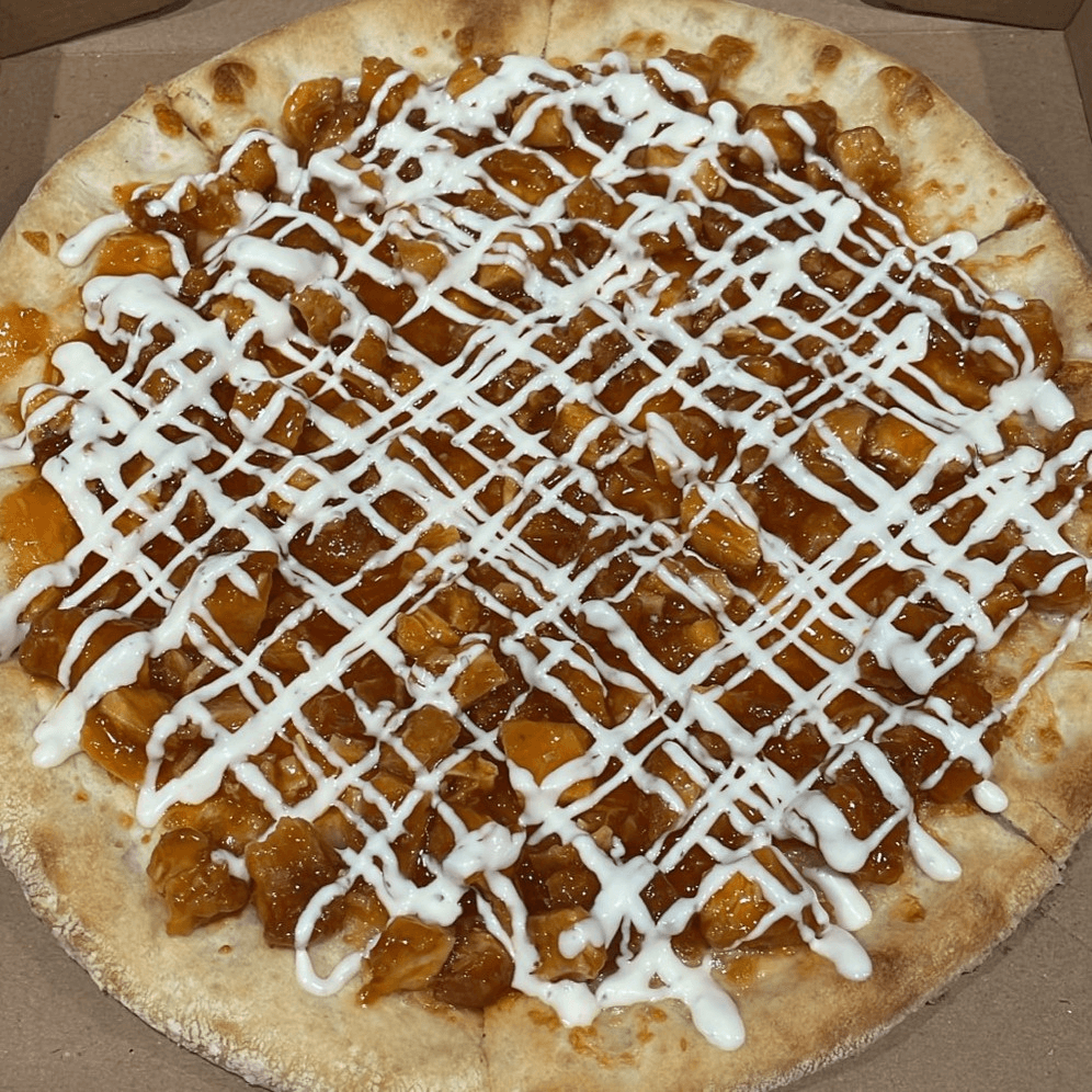 Our savory sweet, buffalo chicken pizza with your choice of bleu cheese or ranch. We use 100% all-natural cheese.