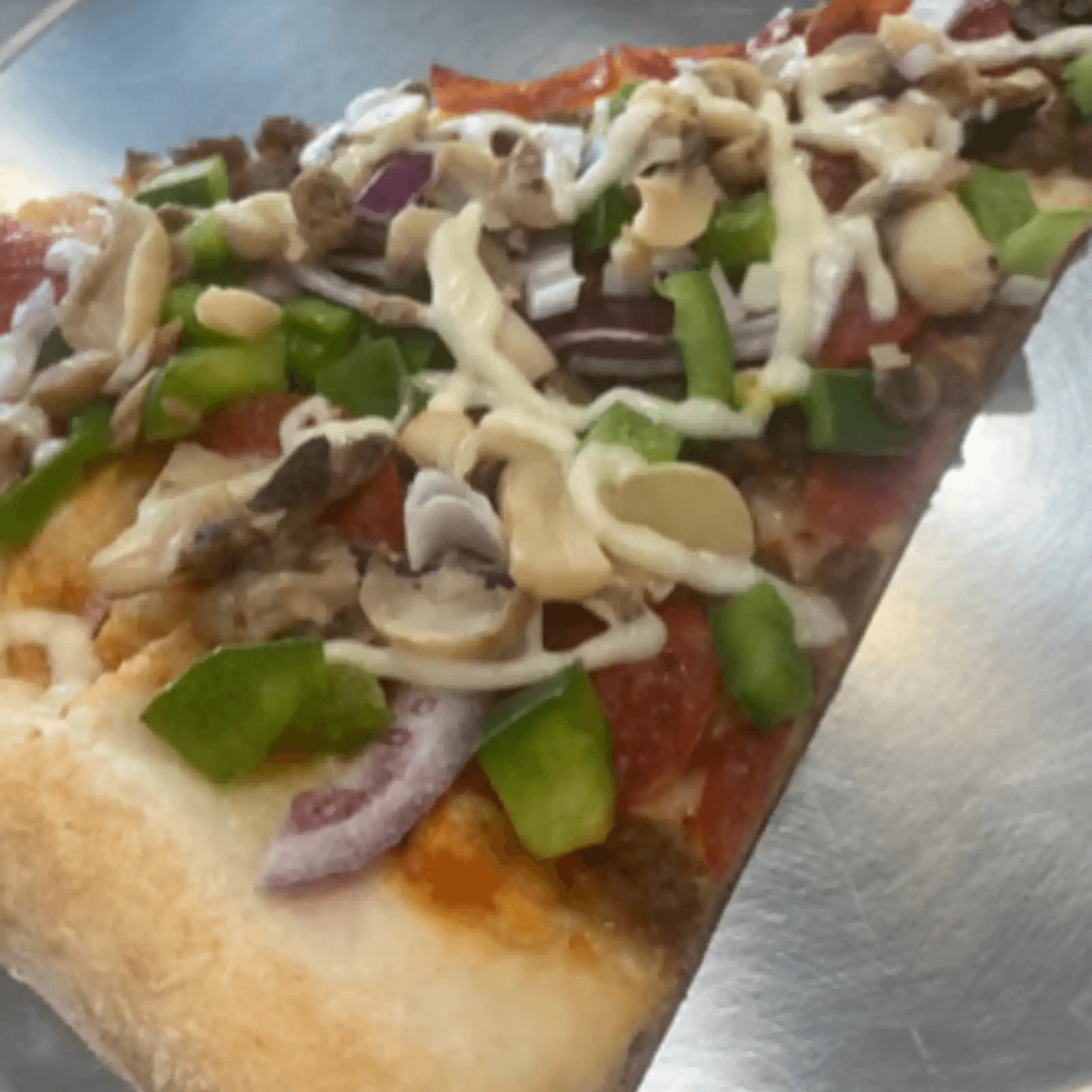 Pepperoni, sausage, onions, green peppers & mushrooms. We use 100% all-natural cheese.